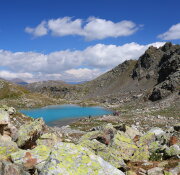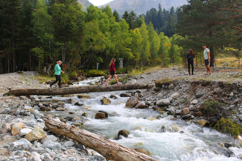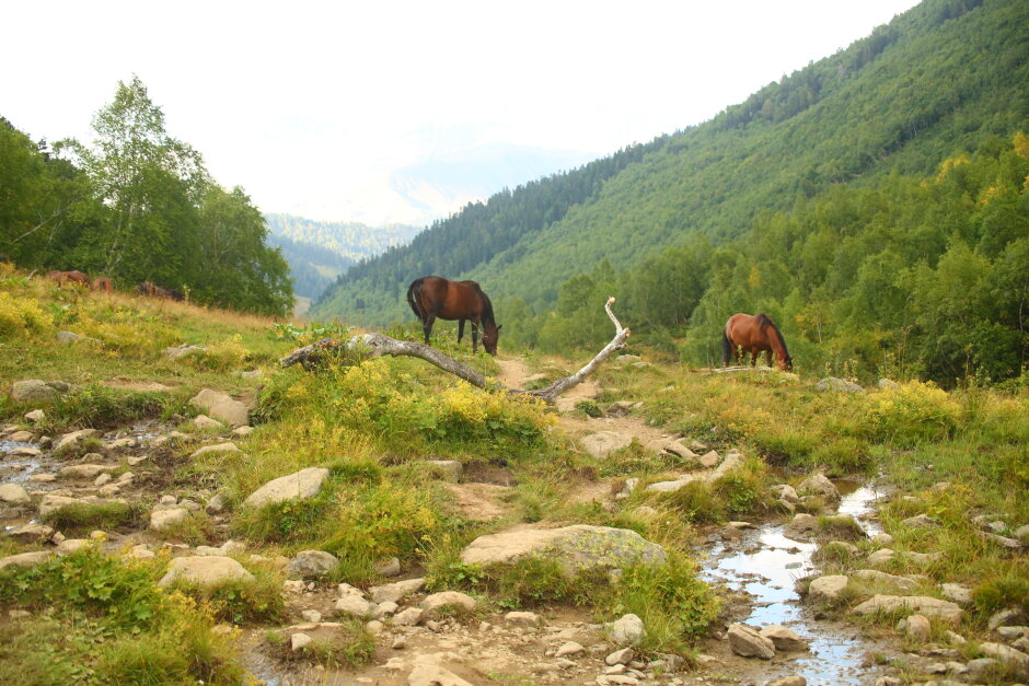 Сегодня путь проходит вдоль реки Малая Дукка. Тропа проходит по альпийским лугам, вдоль спокойно реки с уютными полянами. Потом дорожка начинает забирать круче, река становится стремительней, луга сменяются рододендронами и камнями покрытыми цветными мхами. Далее мы увидим целый комплекс озер, которые расположены на разных высотах и носят причудливые названия: Рыбка, Сказка, Аркасарское.