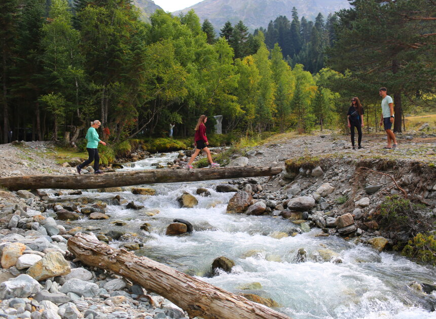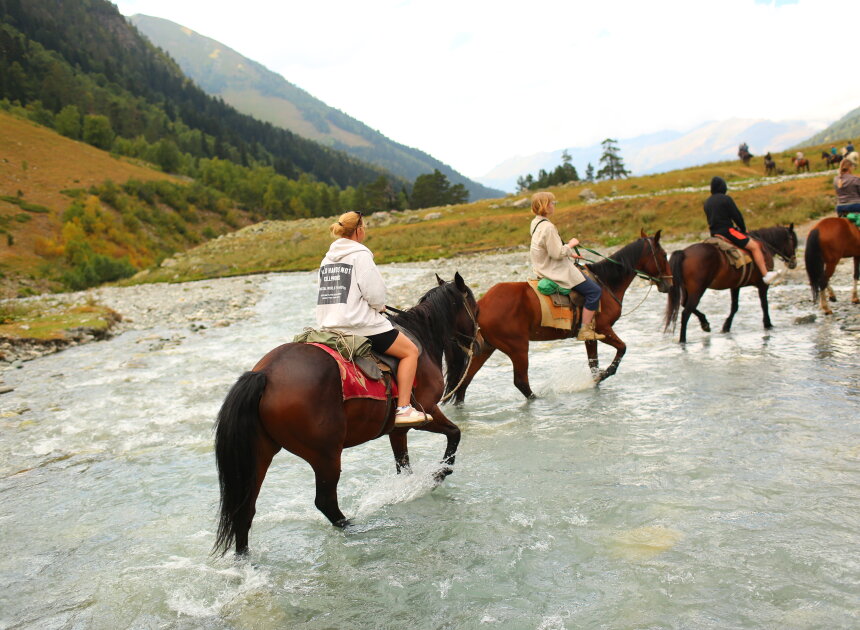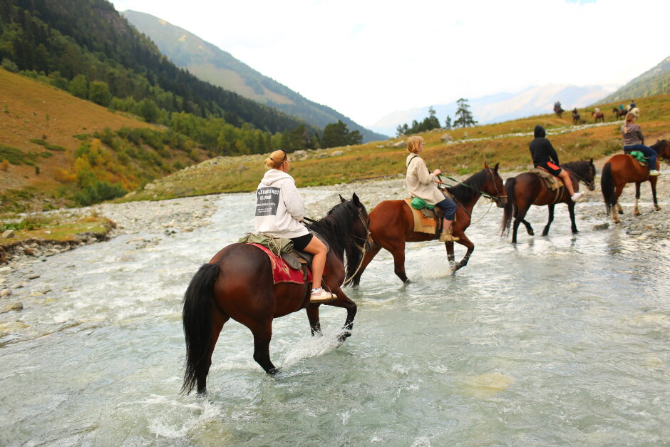 Сегодня сменим тип активности с пешей на водную. По плану рафтинг по реке Большой Зеленчук. Инструктор проведет инструктаж, выдаст весло, гидрокостюм, шлем и спасжилет. Дальше вас ждет 1,5 часа адреналина и драйва по горной реке. После такого всплеска эмоций самое время хорошенько перекусить. Далее на контрасте спокойная прогулка на лошадях по живописным тропинкам долин Архыза.