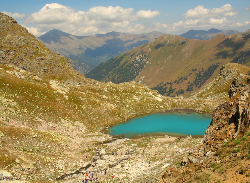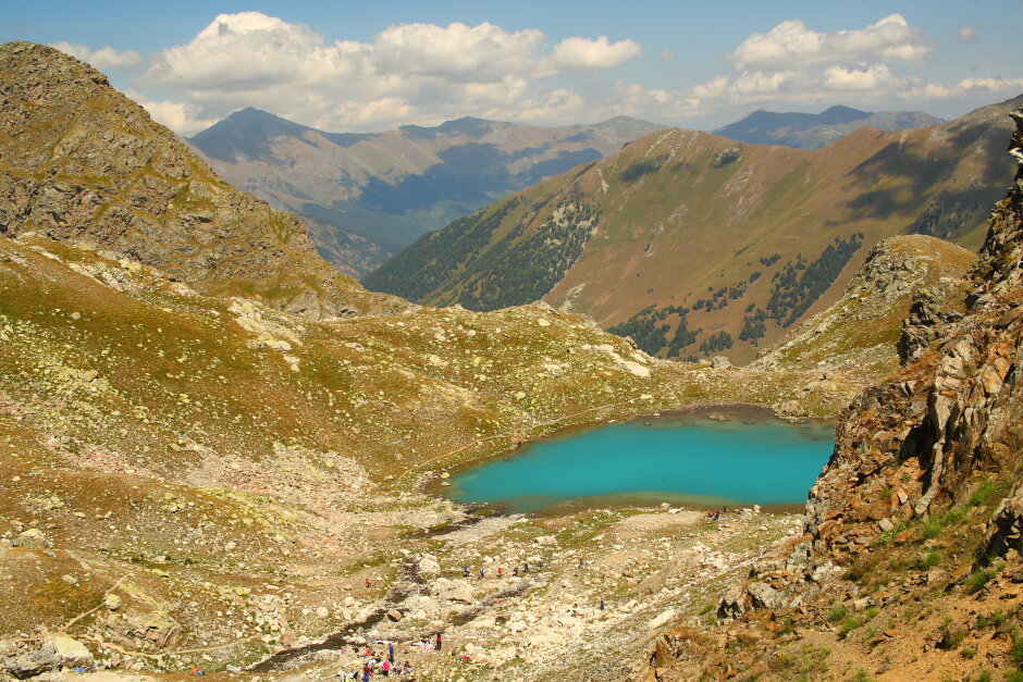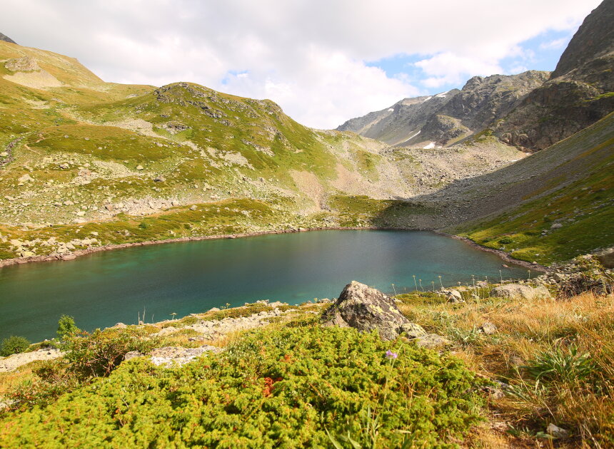 Завтракаем и идем в трекинг к озеру Семицветное. Маршрут к озеру идет с плавным набором высоты через цветущие луга и склоны покрытые кустами сладкой малины. Дно озеро сложено из таких минералов и имеет такой состав, что в солнечную погоду поверхность воды переливается всеми цветами радуги.