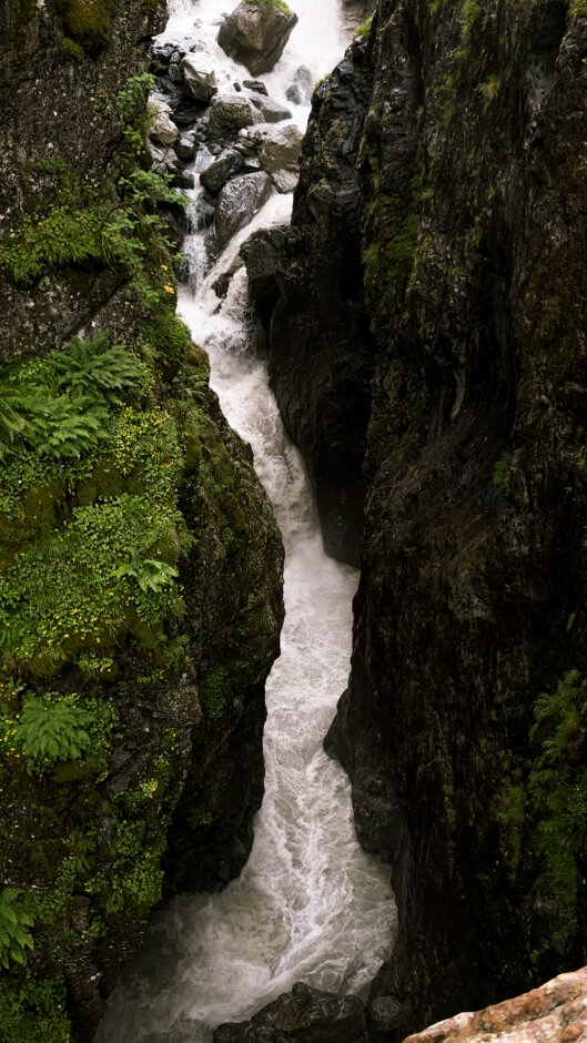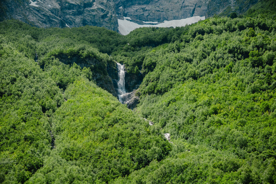 Путь к водопаду начинается от цветущих альпийских лугов и проходит по ущелью реки Алибек. На фоне всю зелень леса украшает белоснежный ледник. Подойдя к водопаду вы будете поражено мощью водных потоков, которые срываются с высоты 25 м. Примечательно то, что ещё в начале XX века водопад был скрыт под толщью ледника, и тем из-за активного таяния он нам открылся.