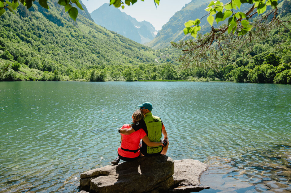 Тропа к Бадукским озерам одна из самых доступных и красивых в любое время года в окрестностях Домбая. Тропа проходит через лес с многолетними пихтами и елями, иногда пересекая бурлящие реки по мосту. Бадукские озера находятся на небольшой высоте, поэтому лес здесь подступает к самому берегу, отражаясь в водной глади.