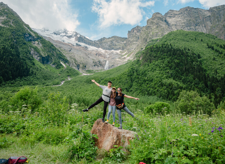 Группа встречается на Жд вокзале города Минеральные Воды в 12:00. Знакомимся и переезжаем в Домбай (4,5 часа в пути). По дороге сделаем пару остановок, чтобы подняться на гору к Шоанинскому храму X века и пообедать в кафе. Вечером заселимся в гостиницу. За ужином познакомимся и обсудим планы на завтра.